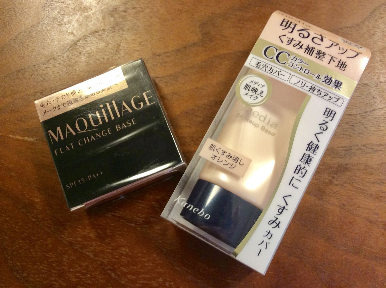 ↑下地系にこの2品。ベースの方は私の顔色(くすみあり)の場合オレンジだけど、赤みが強い人はグリーンの方がよいみたい。