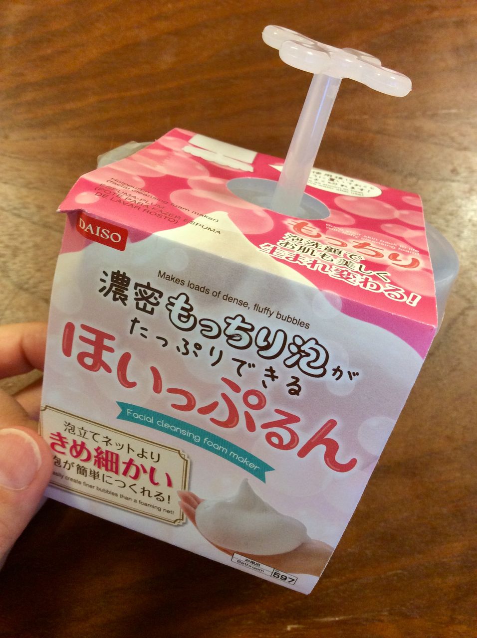 ↑洗顔料を泡立てる器具、100均で売ってる。ちょっとの時間と労力で、ものすごくきめの細かい泡ができる。これで作った泡で「肌にふれず泡を動かすように」洗顔するのだ。